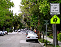 As was the existing practice for bicycle-permeable street closures in Palo Alto, the two closures on the boulevard’s southern segment were both placed just behind the corner curb returns at intersections, forming an apparent three-way junction that was actually four-way for bicycles. It was found that motorists approaching such intersections do not always scan for and yield to bicyclists traversing the street closures. Palo Alto now installs new street closures several car lengths back so intersections appear as four-way for all parties.