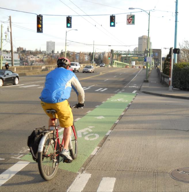 Green pavement markings have received FHWA approval and are being more commonly used, particularly in situations where there tend to be conflicts between motorists and bicyclists like where motorists must cross over a bike lane to make a right turn, or through an intersection.