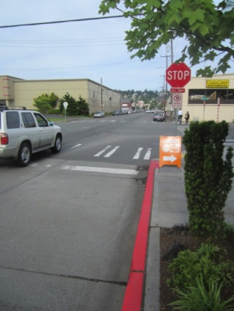 Parking restrictions at intersections may provide help pedestrians to safely cross the street by providing them with a clearer view of oncoming vehicles. Source: Peter Lagerwey.