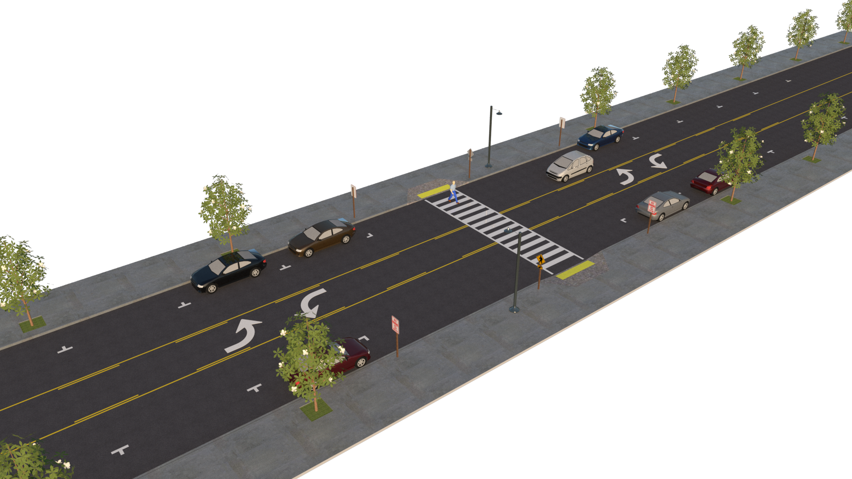 However, it may also be important to provide physical roadway measures to prevent motorists from parking on the sidewalk or in areas intended for pedestrians to walk. Curb extensions improve sightlines and shorten the distance pedestrians need to cross a roadway.