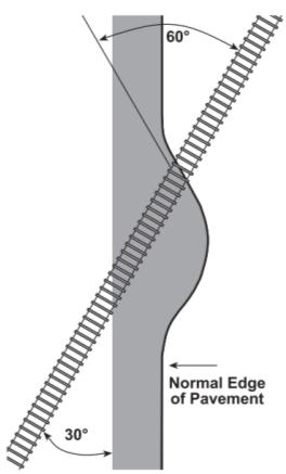 Finally, care must be taken to provide bicycle-safe railroad crossings. Crossings should ideally be close to 90 degrees. If the crossing is smooth, but non-slippery (concrete paving may work best), and the flange opening is kept as narrow as possible, somewhat more flexibility with the angle may be possible.