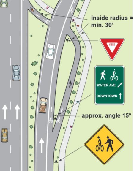 Design option for bicyclist crossing at a high-speed exit ramp. Illustration from Oregon Bicycle and Pedestrian Design Guide, Oregon DOT