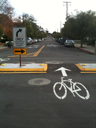 This diverter in San Luis Obispo, CA, is one component of a bicycle boulevard (also pictured below). http://www.pedbikeimages.org/ - Adam Fukushima