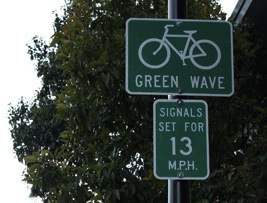 Another strategy in signal timing is coordinating signals to provide a "green wave." In a green wave, signals along a corridor are timed such that vehicles will receive a green indication and not be required to stop if vehicles progress at a certain speed. Signal progression speeds should include considerations for bicyclists' operational characteristics. Several cities including Portland, Oregon, and San Francisco, California, have implemented green waves for bicycle speeds. An additional advantage of coordinating signals using a bicyclist's speed is that motorists' speeds are also reduced, creating a more comfortable environment for all users.