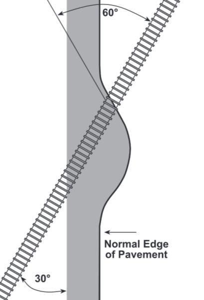 Correction for a skewed rail crossing through the provision of a widened paved shoulder or bike lane. Illustration from Oregon Bicycle and Pedestrian Design Guide, Oregon DOT