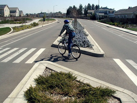 Curb extensions may also be built in conjunction with center crossing islands where there is on-street parking. Care should be taken to maintain bicycle access, as bicycle lanes must not be eliminated or squeezed in order to create the curb extensions or islands.