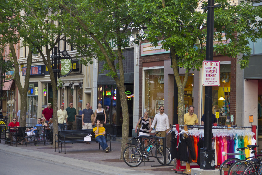 Sidewalks can be categorized by four zones: curb, furniture, pedestrian, and frontage. The curb zone provides a barrier from the street and a transition to the street from the sidewalk. The furniture zone is where all items that could potentially block pedestrian traffic should be placed. Poles, signposts, newspaper racks, and other obstacles that could block the path, obscure a driver or pedestrian’s view, or become a tripping hazard should be placed in the furniture zone. Benches, water fountains, bicycle parking racks, and transit shelters should also be placed there. Another benefit of the furniture zone is that it provides a barrier between pedestrians and the street. The pedestrian zone is where pedestrians walk and should be at least 5 feet but preferably wider. Even wider pedestrian zones may be desirable in active areas with high volumes of pedestrian traffic. Lastly, the frontage zone provides a space between pedestrians and buildings. Pedestrians subconsciously move away from vertical faces, so the frontage zone is an important buffer area that prevents the pedestrian from feeling confined.6