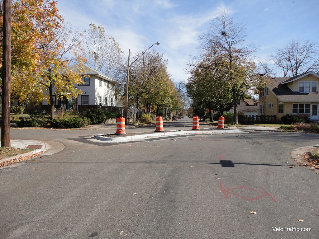 A diverter preventing traffic from cutting through the residential neighborhood. Source: Flickr - VeloTraffic (2010)